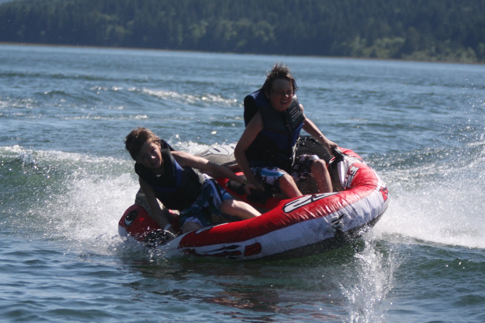After that tame ride, Christi asked Heather to join her in the tube for more of a "challenge". Travis took over the driving at that point, John took the camera - and he (and previously I) quickly determined why it is Kaela gets sea sick as soon as the tube comes out. Trying to track the motion of the tube through the camera while the boat is whipping violently back and forth is not easy!